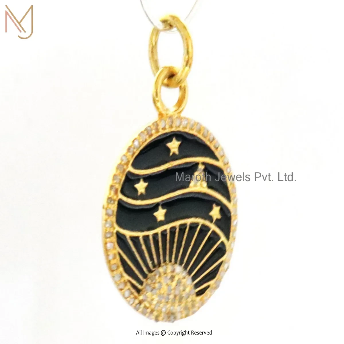 925 Silver Yellow Gold Plated Pave Diamond Black Enamel Sun And Star Pendant USA