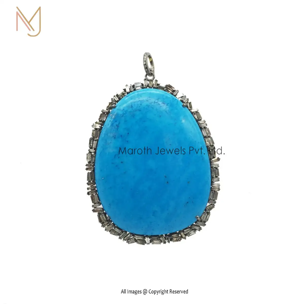 925 Sterling Silver Pave Diamond Baguettes &Turquoise Pendant Jewelry USA