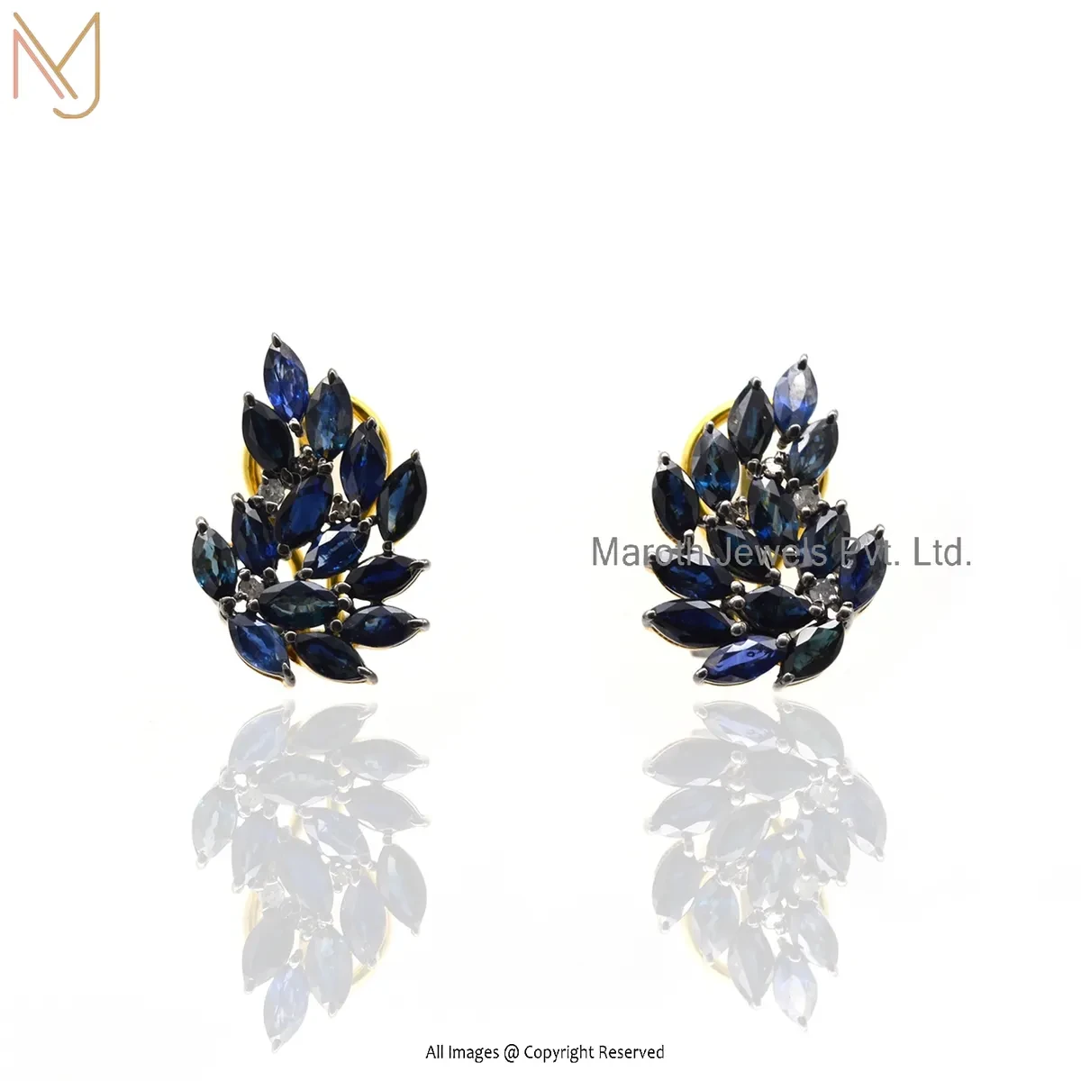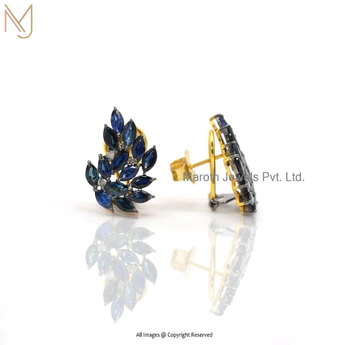 Private Lable 14K Yellow Gold Pave Diamond & Blue Sapphire Tiny Leaf Stud Earring