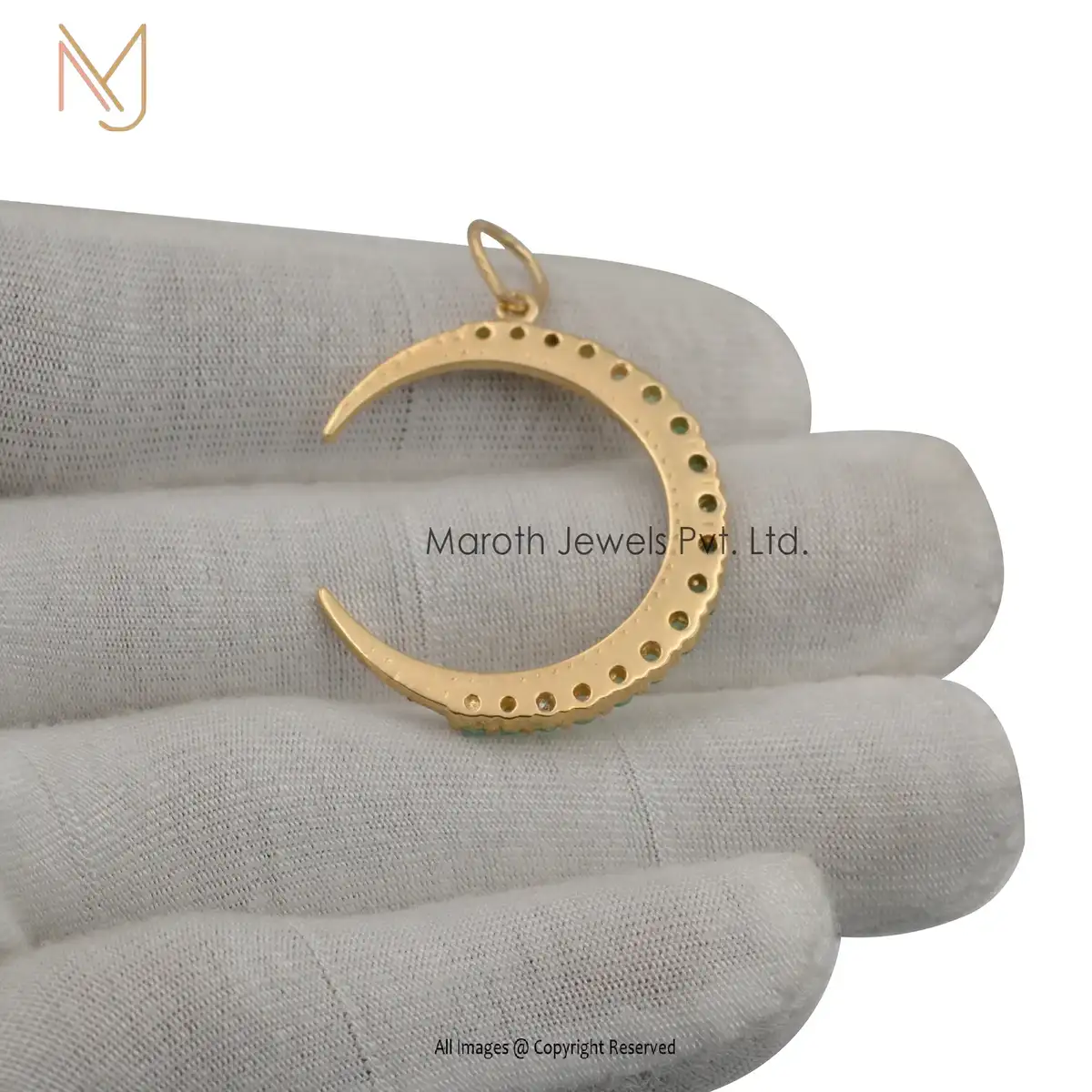 Private Lable 14K Yellow Gold Pave Diamond Emerald Moon Pendant Jewelry