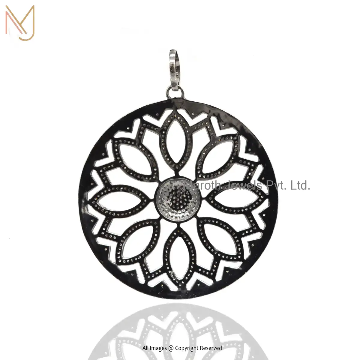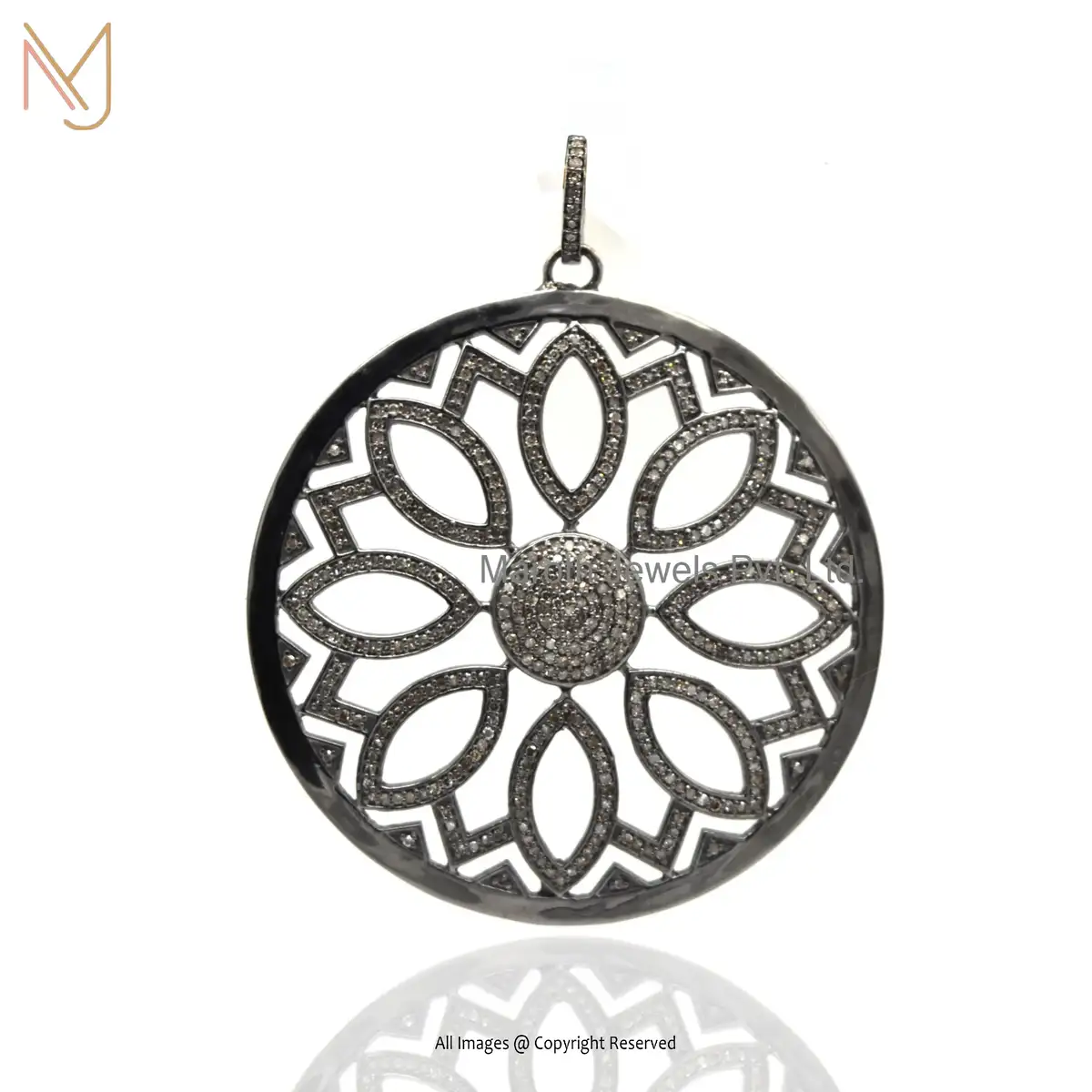 Private Lable 925 Silver Black Rhodium Plated Pave Diamond Disc Flower Pendant Jewelry