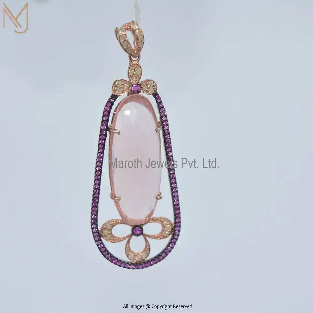 Private Lable 925 Sterling Silver Rhodium Rose Gold Plated Diamond Ruby & Rose Quartz Gemstone Pendant Jewelry